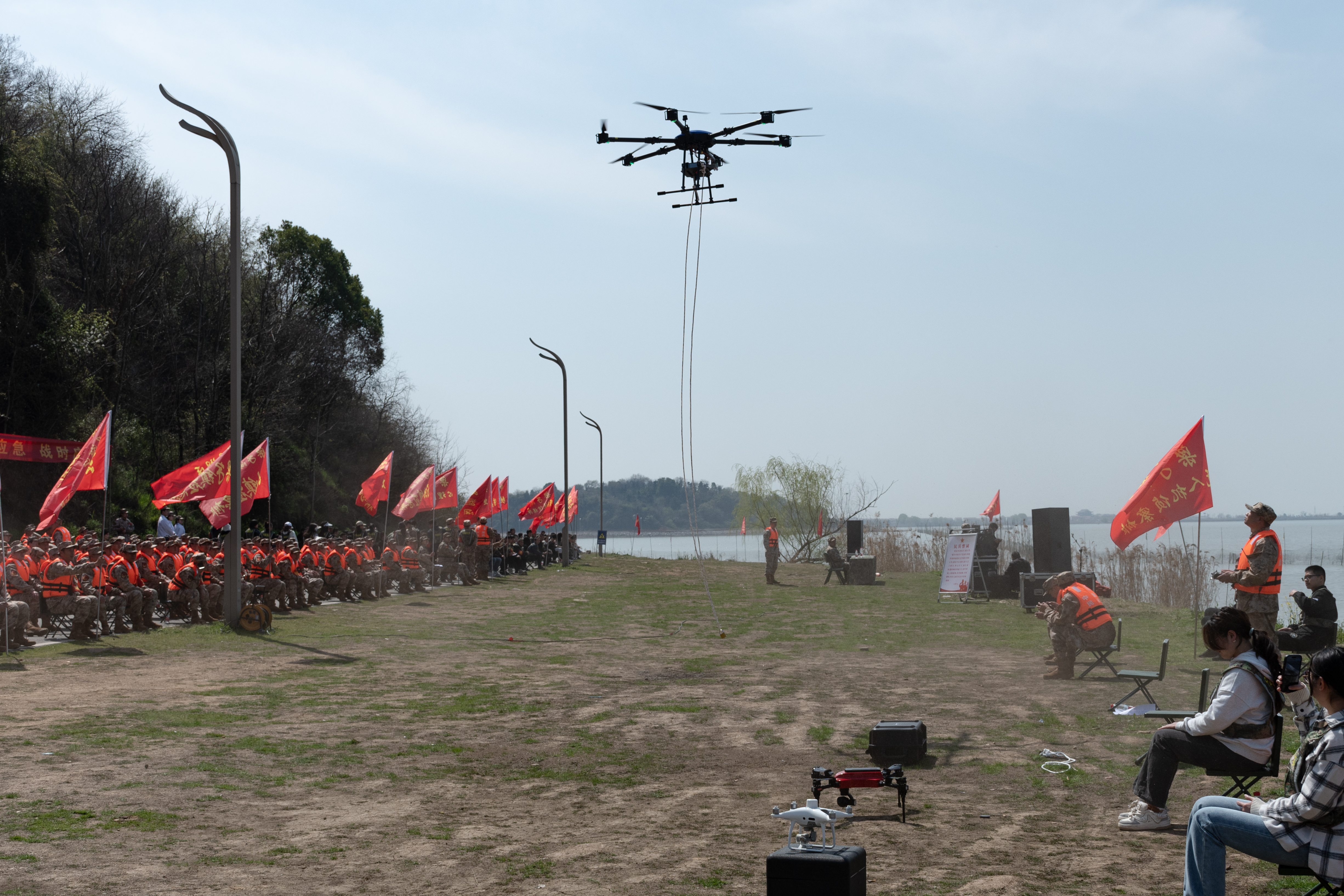 “若有战、召必回”。一场以“梁子湖水域突发险情”为背景的空地一体联合救援演练拉开帷幕。执勤人员上报灾情后,无人机侦察分队迅速侦察锁定目标,空中抛投无人机携带救生圈、救生索跟进救援,应急救援快艇快速展开队形,跟进空中抛投无人机进行水上打捞救援,成功实施落水人员搜救、群众转移等任务。演练首次嵌入战时卫勤保障科目教学,检验民兵分队平战转换能力。在随后进行的应急医疗救援演练中,民兵医疗分队模拟落水事故现场,迅速搭建野战救护所,完成伤员检伤分类、紧急救治;战时医疗救援演练则突出野战条件下批量伤员转运与手术支援,锤炼队伍快速反应和军地协同能力。