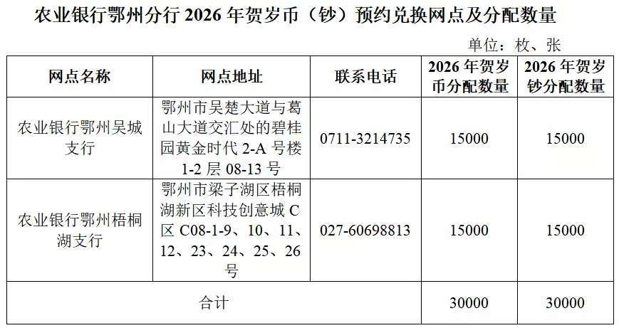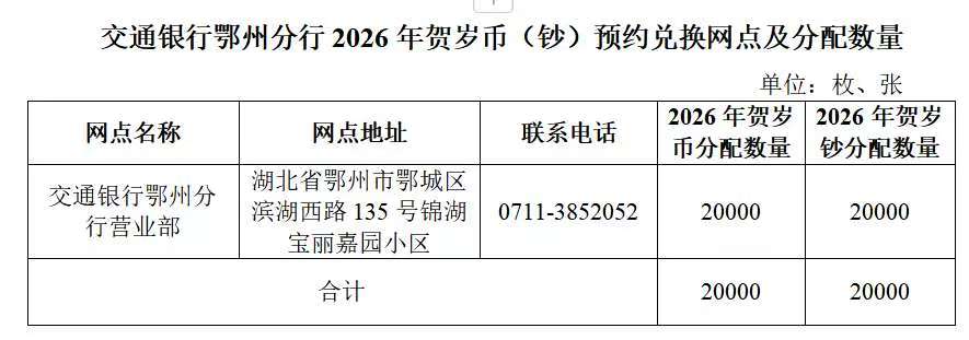 根据中国人民银行纪念币发行工作安排,2026年贺岁普通纪念币、2026年贺岁纪念币钞(以下分别简称“2026年贺岁币”“2026年贺岁钞”)将于2026年1月13日起开始预约发行。鄂州市分配数量为2026年贺岁币8.0万枚、2026年贺岁钞8.0万张,将由工商银行、农业银行、交通银行(以下统称“承办银行”)共同承担鄂州市2026年纪念币(钞)的预约发行工作。2026年贺岁币面值10元,每人预约、兑换限额为20枚,2026年贺岁钞面值20元,每人预约、兑换限额为20张。