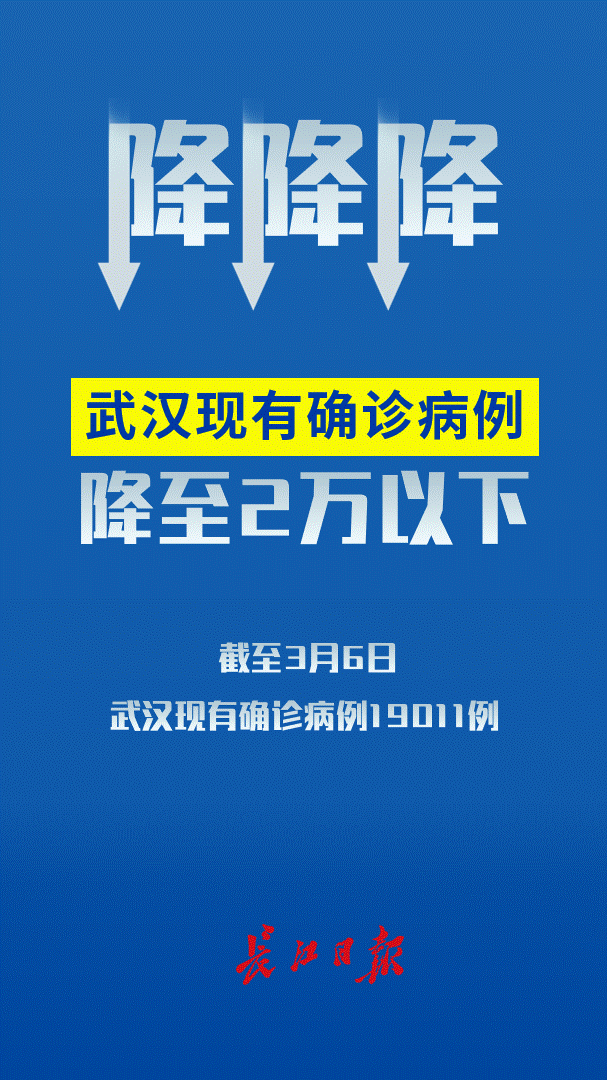 今天上午,国家及省卫健委公布了3月6日新冠病毒肺炎最新疫情,武汉市新增确诊病例74例,湖北除武汉外所有市州新增确诊病例为0。武汉从3月1日来,持续5天新增确诊均为100多例,6日终于跌至两位数。 此外,武汉市新增疑似病例46例,比5日仅增长4例,保持稳定态势。随着出院患者增多,现有确诊病例降至2万以下,达19011例。 业内人士认为,下一步,武汉市疫情防控重点应该放在重症救治及彻底切断传染源上。 来源:长江融媒