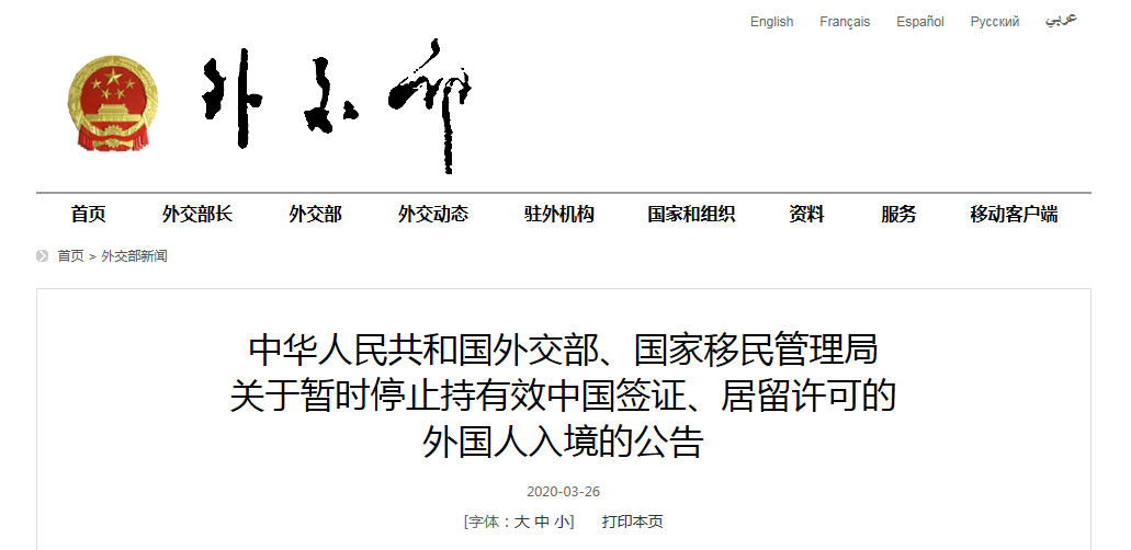 鉴于新冠肺炎疫情在全球范围快速蔓延,中方决定自2020年3月28日0时起,暂时停止外国人持目前有效来华签证和居留许可入境。暂停外国人持APEC商务旅行卡入境。暂停口岸签证、24/72/144小时过境免签、海南入境免签、上海邮轮免签、港澳地区外国人组团入境广东144小时免签、东盟旅游团入境广西免签等政策。持外交、公务、礼遇、C字签证入境不受影响。外国人如来华从事必要的经贸、科技等活动,以及出于紧急人道主义需要,可向中国驻外使领馆申办签证。外国人持公告后签发的签证入境不受影响。