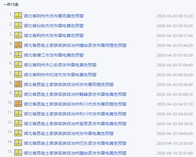 荆州市气象台2020年04月20日08时13分发布雷电黄色预警信号:预计未来6小时,荆州区,沙市,江陵有雷电活动,雨量20-40毫米,阵风6到8级,请注意防范。