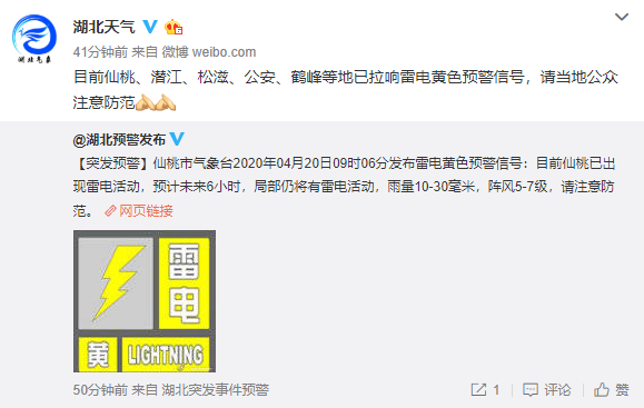 仙桃市气象台2020年04月20日09时06分发布雷电黄色预警信号:目前仙桃已出现雷电活动,预计未来6小时,局部仍将有雷电活动,雨量10-30毫米,阵风5-7级,请注意防范。