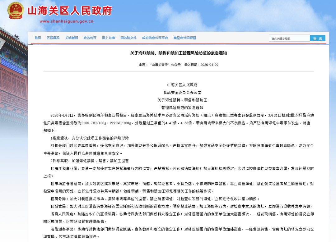 秦皇岛山海关区政府也发布紧急通知检测出其贝类毒素超标4倍以上提醒消费者近期不宜食用海虹