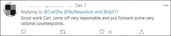最后,Carl Zha表示:“莫里森一天到晚都在批评中国,澳大利亚媒体也是一样。为什么中国批评一下澳大利亚,你们就无法接受了?我觉得这就有点虚伪了,如果澳大利亚认为:在人权方面,我们可以批评你,但你不能批评我们。”