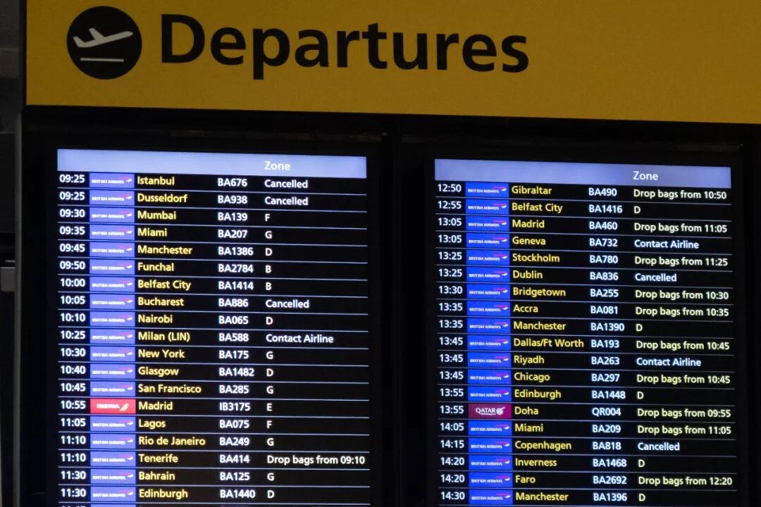 12月21日,英国伦敦希思罗机场第五航站楼内显示多趟航班被取消。新华社发(蒂姆·爱尔兰摄)
