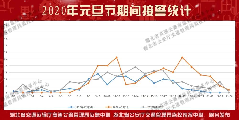 根据湖北省公安交管局监控指挥中心对2020年接警统计历史数据分析,从“元旦”假期当日警情时段分布来看,高峰期在8时至12时、14时至18时;警情数量与交通流量成正比。