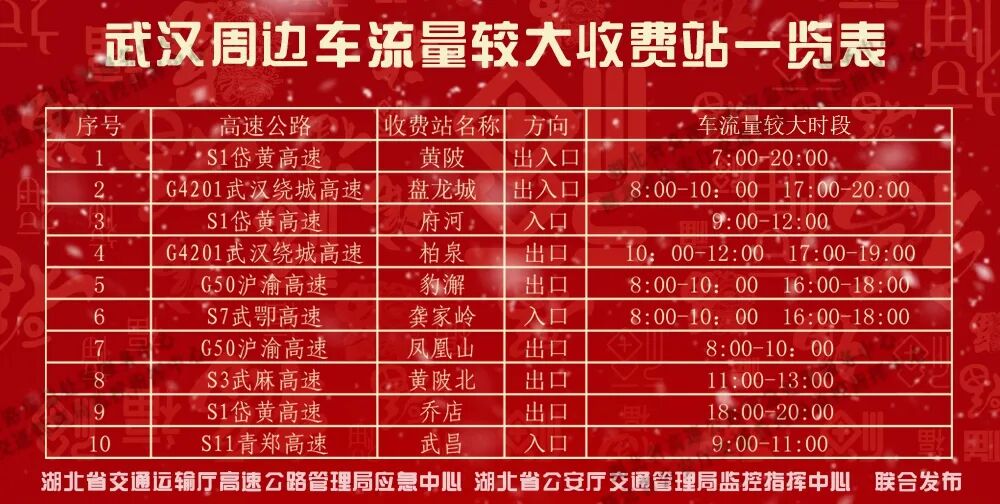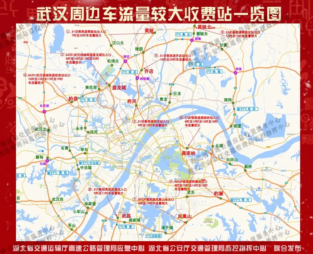 从往年经验看,高速公路车流量较大时,可从就近收费站下高速公路,绕行与之平行的国、省道,会更加快捷;进出武汉市的车辆,由于外环、四环、三环、二环线和出城快速通道是连通的,可以根据实际情况避开易缓行路段灵活绕行。