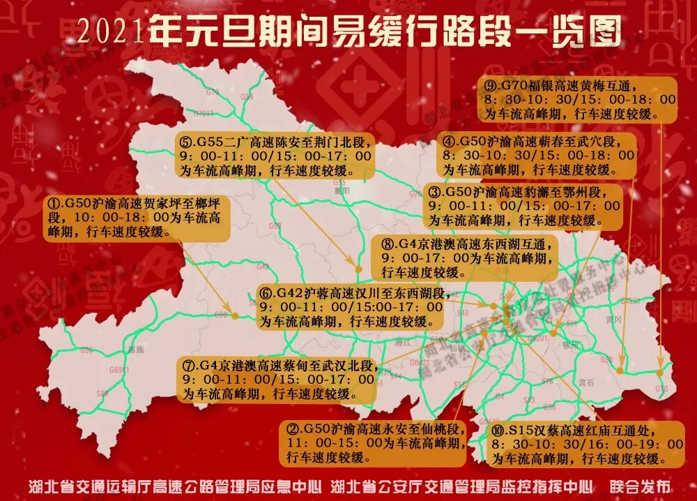 近日湖北省高速公路管理局应急处置服务中心、省公安厅交通管理局监控指挥中心联合发布《2021年“元旦”假期湖北省高速公路出行指南》