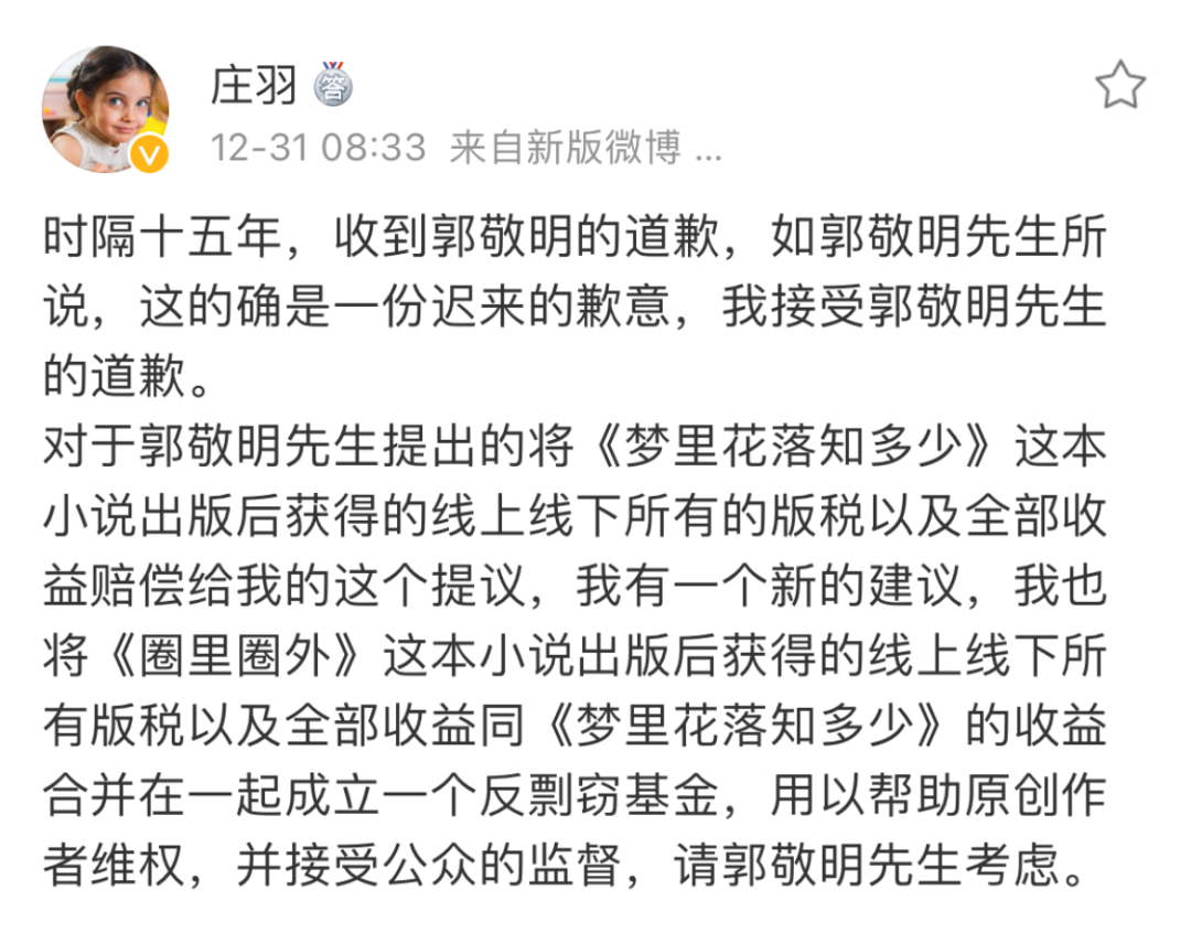 2020年12月31日零时,郭敬明就当年小说《梦里花落知多少》抄袭庄羽的作品《圈里圈外》一事在微博上道歉,并表示将把《梦里花落知多少》的版权收入全部捐赠给庄羽。