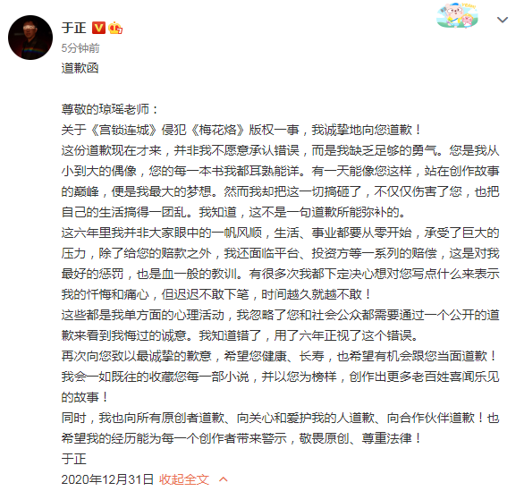 刚刚,于正在微博发布道歉函,就关于《宫锁连城》侵犯《梅花烙》版权一事,诚挚地向琼瑶道歉。