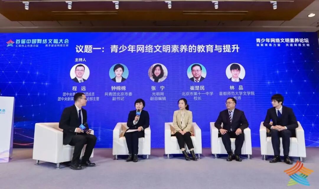 在“青少年网络文明素养的教育与提升”圆桌论坛中,共青团北京市委副书记钟棉棉、北京市第十一中学校长崔楚民、光明网副总编辑张宁、首都师范大学文学院教师林品分别结合各自领域分析了青少年网络文明素养发展现状,并对如何为青少年健康成长塑造风清气正、向上向善网络环境献计献策。