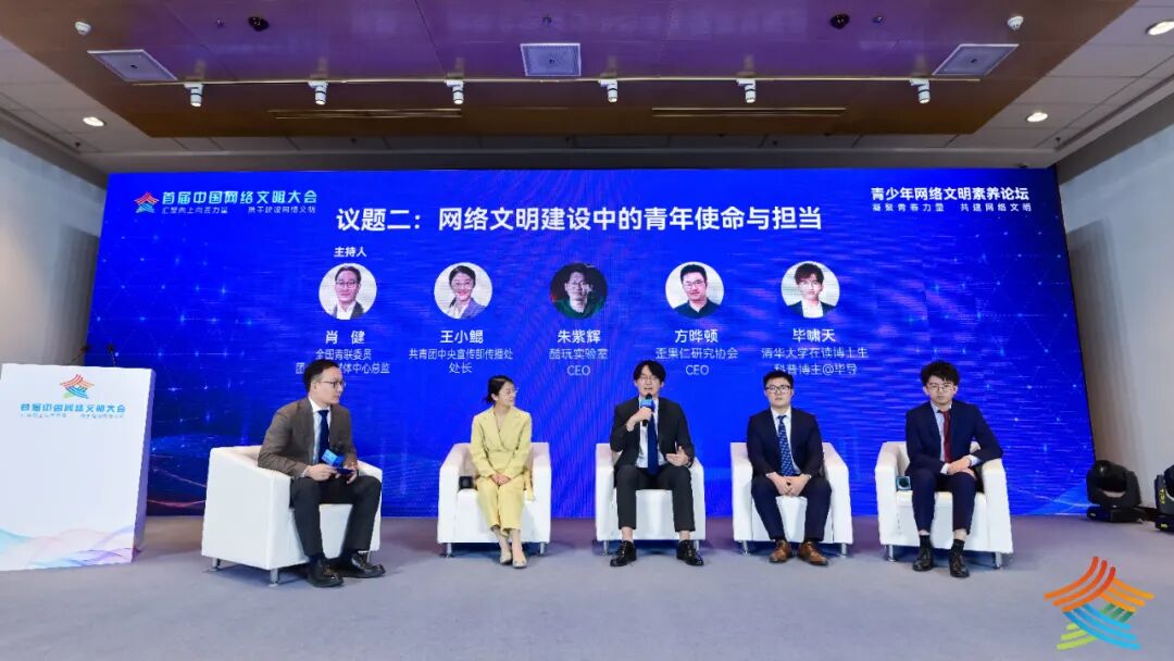在“网络文明建设中的青年使命与担当”圆桌论坛中,共青团中央宣传部传播处处长王小鲲、酷玩实验室CEO朱紫辉、歪果仁研究协会CEO方晔顿、科普博主@毕导 毕啸天,围绕政务新媒体和自媒体行业在青少年网络文明素养培养中的创新探索等话题展开深度交流。
