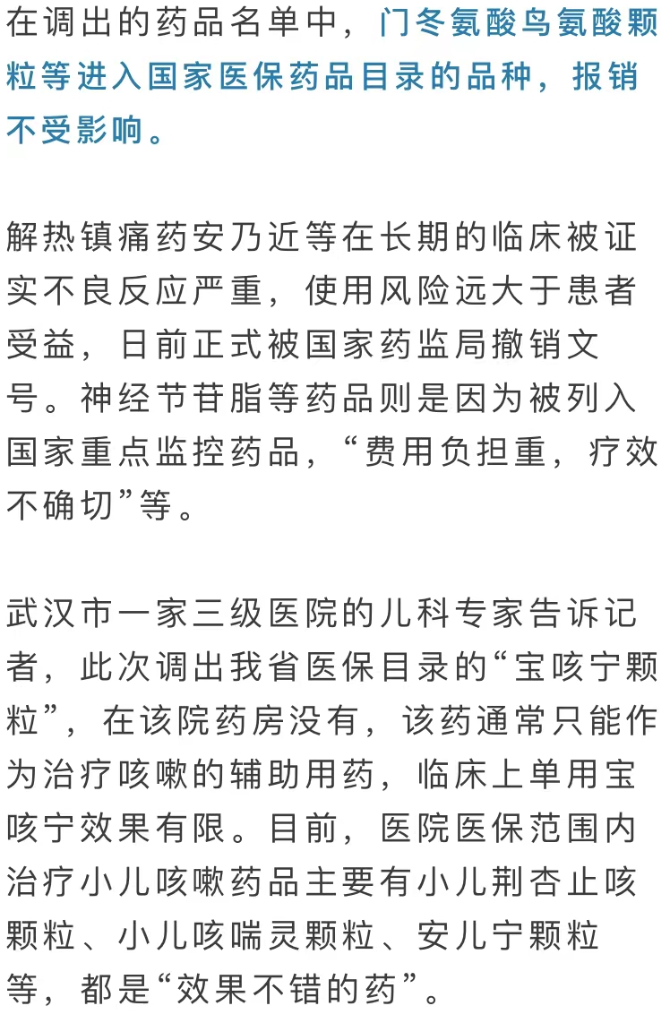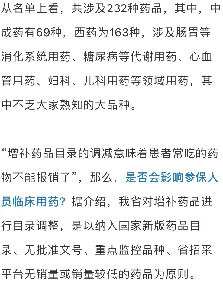 2019年12月,湖北省开始对原省级增补药品进行调出。其中,2019年,我省首批调出164种药品,占全部药品品种数的46.32%后,保留药品归为《湖北省消化过渡期药品(2019年版)》。明起,这些药品全部调出我省医保目录。