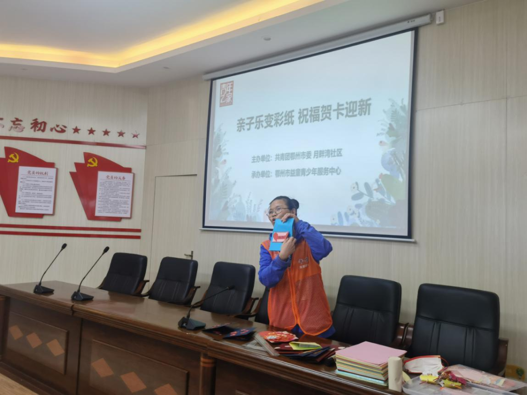 高质量的亲情陪伴是传递爱的有效纽带。为 了进一步让辖区家长和小朋友们尽情享受欢乐的亲子时光,2021年12月26日,在新年来临之际,月畔湾社区联合共青团鄂州市委、鄂州益童青少年服务中心共同开展“亲子乐变彩纸、祝福贺卡迎新”亲子手工贺卡DIY活动。