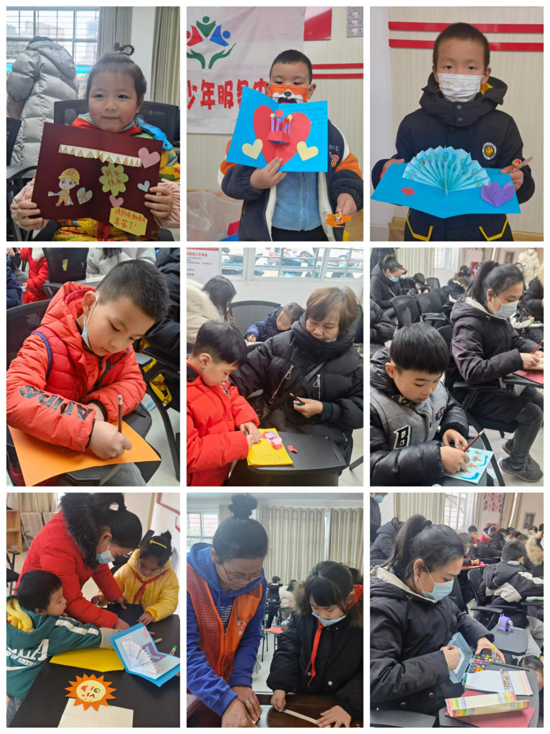 活动中,志愿者张老师首先向在座的家长和小朋友们介绍了元旦节的来历,真是有一代又一代的共产党人的不懈努力和奋斗,才有了我们今天的幸福生活,我们要学会珍惜和感恩,接着,向大家展示了手工元旦贺卡作品,详细讲解了制作贺卡的方法和技巧,小朋友们看到一张张精美贺卡纷纷动手尝试,小朋友们在选择了自己喜欢的贺卡样式和彩笔后在志愿者张老师和家长的协助下,不到一会儿,一张张饱满祝福的元旦贺卡就制作完成了,有的小朋友制作的是爱心贺卡,有的小朋友制作的是老虎贺卡,有的小朋友制作的孔雀贺卡,有的小朋友们制作的是彩虹贺卡......
