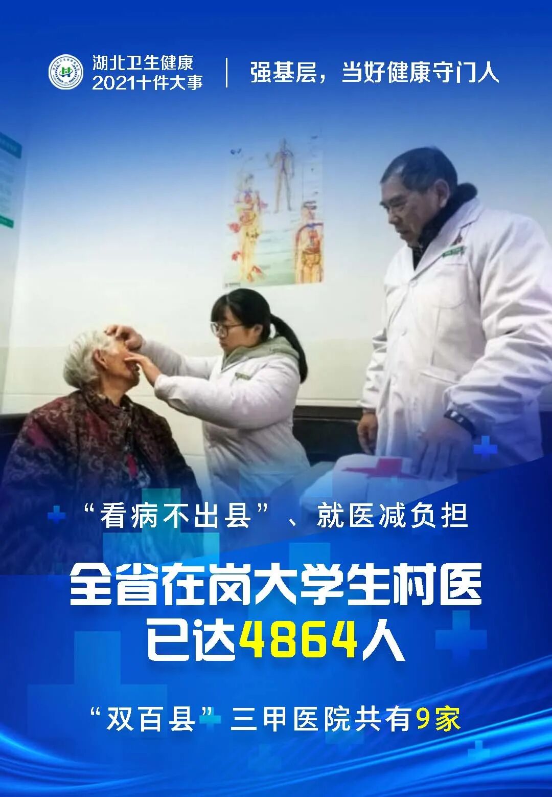 截至2021年,全省在岗大学生村医4864人,全省“双百县”新增4家三级甲等医院,总数达到9家。