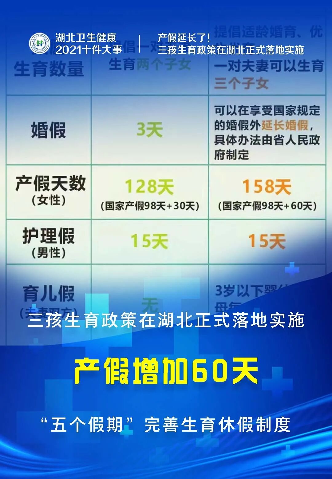 围绕实施三孩生育政策,我省完善配套积极生育支持措施。重点完善生育休假制度,具体规定了“五个假期”:符合法律法规规定生育的妇女,除享受国家规定的产假外,增加产假60天,其配偶享受15天护理假;3岁以下婴幼儿父母每人每年享受累计10天育儿假;对赡养人、扶养人照顾失能或者患病住院老年人的,给予每年累计不少于10天的护理时间,独生子女不少于15天。婚假、产假、护理假和育儿假视同出勤,工资、奖金照发。