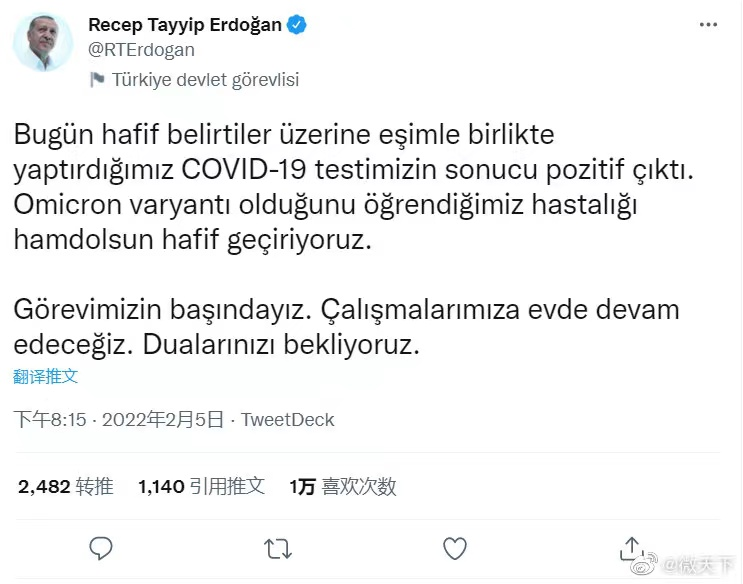 当地时间2月5日土耳其总统埃尔多安在其社交账号上确认在出现轻微新冠肺炎症状后其与夫人的新冠检测结果呈阳性并确认感染的是奥密克戎毒株目前正在家隔离,居家办公
