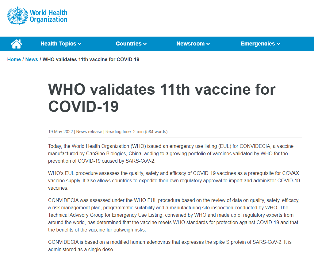 5月19日,世界卫生组织宣布将中国康希诺生物研制的重组新型冠状病毒疫苗(5型腺病毒载体)“克威莎”列入世卫组织紧急使用清单。这是中国第三款列入世卫组织紧急使用清单的新冠疫苗,也是该清单中中国首款腺病毒载体新冠疫苗和单剂次新冠疫苗。