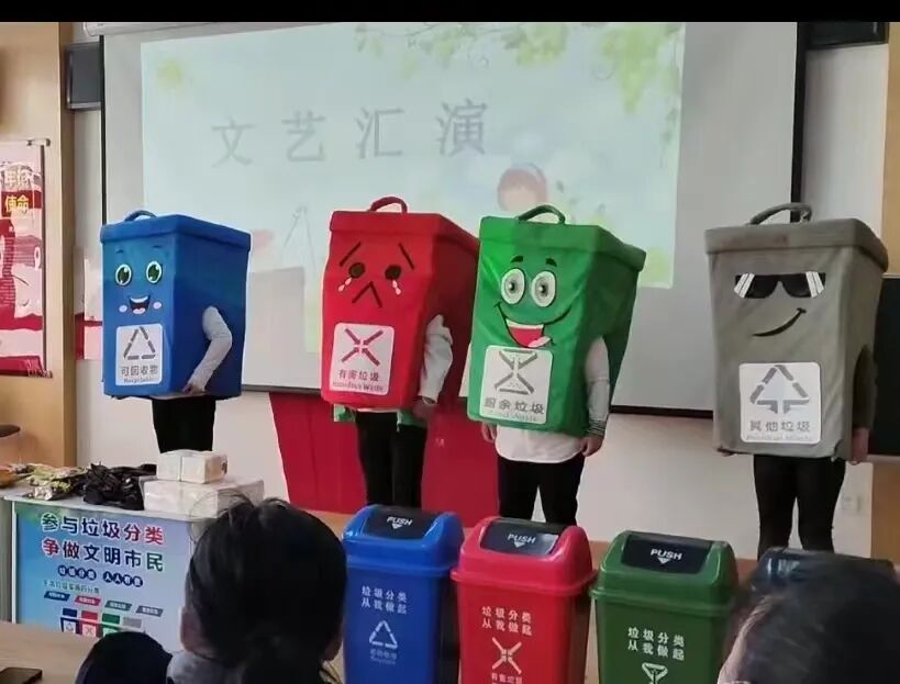 伴随着欢快的鼓点,垃圾分类真人秀来了,身穿四分类垃圾桶模特以整齐的步伐走上台来。他们分别代表红蓝绿灰四分类桶。希望每位居民从源头上将垃圾分离出来并正确投放,减少污染,提高资源的利用率。