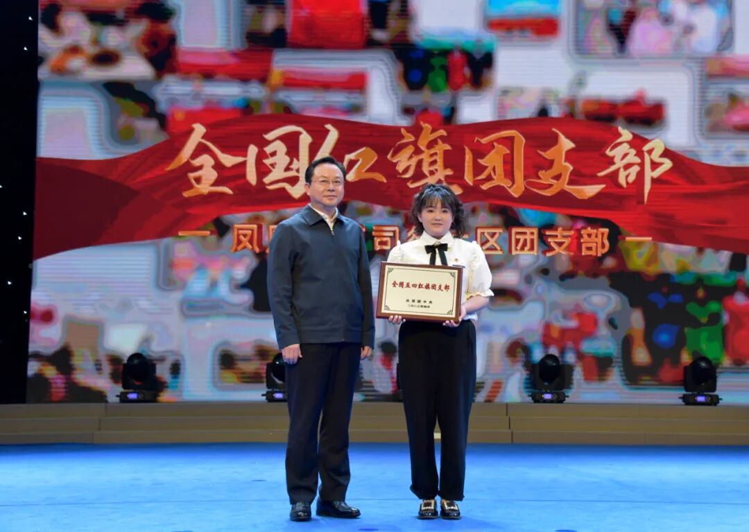仪式现场,100名新发展团员代表面向团旗庄严宣誓,光荣加入中国共产主义青年团。我市全国优秀共青团员、全国优秀共青团干部、全国五四红旗团支部获奖代表上台领奖。孙兵为全国五四红旗团支部凤凰街道司徒社区团支部颁奖。