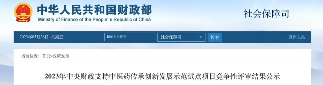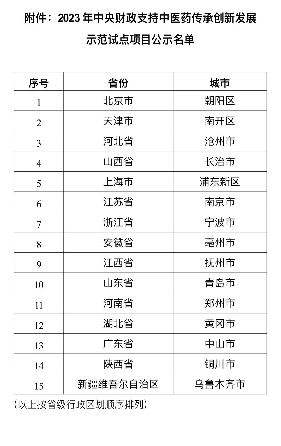 按照《财政部办公厅 国家中医药局综合司关于组织申报中央财政支持中医药传承创新发展示范试点项目的通知》(财办社〔2023〕14号)明确的程序,财政部、国家中医药局组织专家对各地申报项目实施方案进行了竞争性评审。根据竞争性评审结果,拟将15个项目确定为2023年中央财政支持中医药传承创新发展示范试点项目(详见附件)。 现将评审结果予以公示,公示期为2023年5月26日至2023年6月1日。如对评审结果有意见,请在公示期内以书面(实名)形式反馈至财政部社会保障司、国家中医药局中西医结合与少数民族医药司。 联系电话:010-59957671 010-68551297 财政部社会保障司 国家中医药局中西医结合与少数民族医药司 2023年5月26日