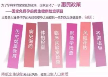 为帮助您生育健康的宝宝,促进家庭幸福,减少出生缺陷,国家免费孕前优生健康检查项目(即婚前优生检查和孕前优生检查)已在全国实施十几年了,为准备怀孕的夫妇免费提供一系列的婚前孕前优生保健服务。