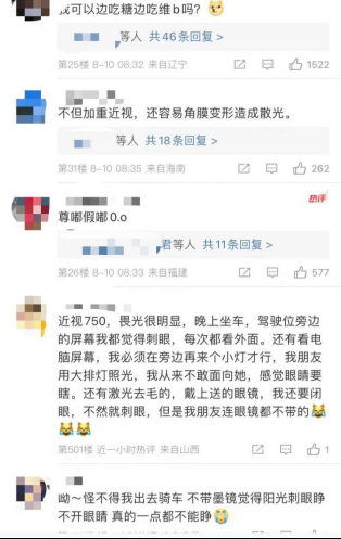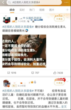 记者浏览该话题,有博主称,近视的人,一定不要喝太多奶茶,糖分吸收会消耗维生素B,眼睛容易模糊畏光,糖分属于酸性,会消耗大量钙,缺钙会导致眼球软化,加重近视。