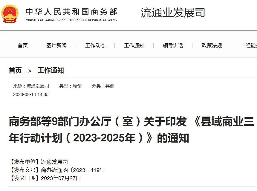 商务部等九部门14日联合发布《县域商业三年行动计划(2023—2025年)》,进一步推动供应链、物流配送、商品和服务下沉以及农产品上行,力争到2025年建立县域统筹,以县城为中心、乡镇为重点、村为基础的农村商业体系。