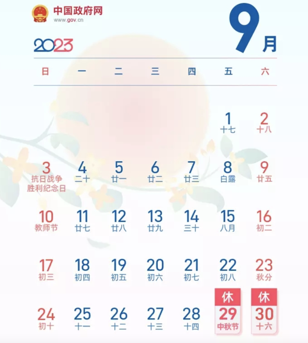 8月14日,国务院办公厅印发的《关于2023年部分节假日安排的通知》显示,2023国庆中秋连休8天。
