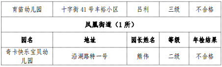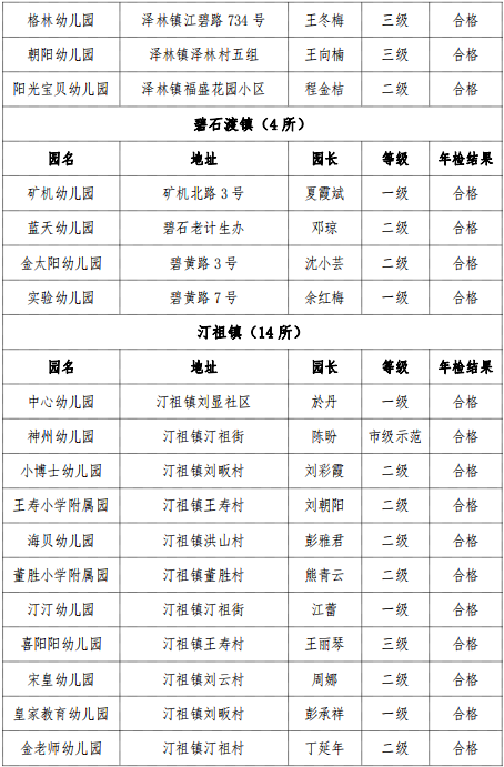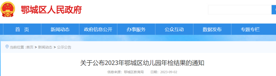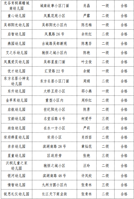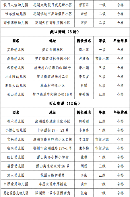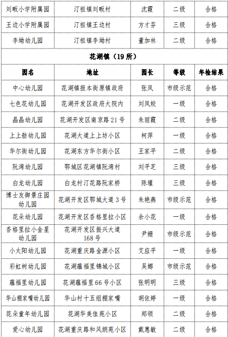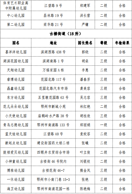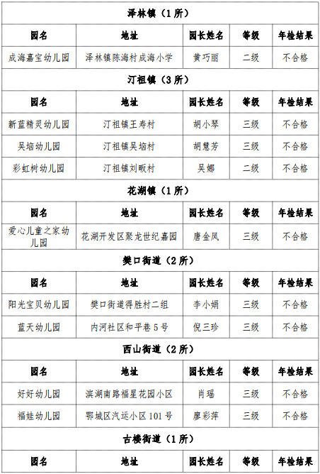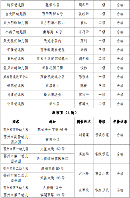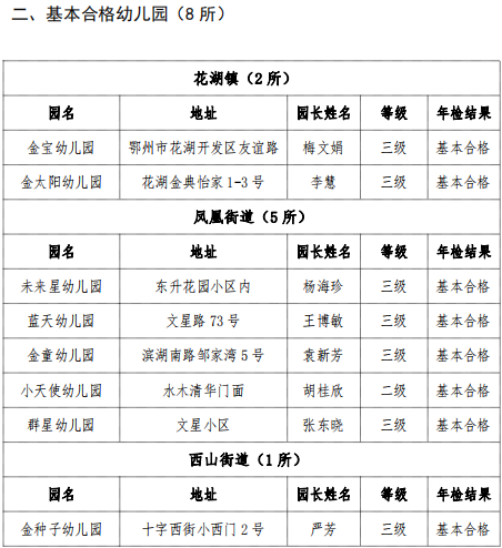 根据省、市教育部门关于完善落实幼儿园年检制度的工作要求,以及《区教育局关于做好2023年幼儿园年检工作的通知》(鄂城教幼发〔2023〕3号)精神,为规范各地、各园办园行为,促进全区学前教育健康发展,经各幼儿园自查申报,属地镇、街道中心学校检查认定,区教育局抽查复评,区政府官网公示,现将2023年鄂城区幼儿园年检结果予以公布(具体名单附后)。