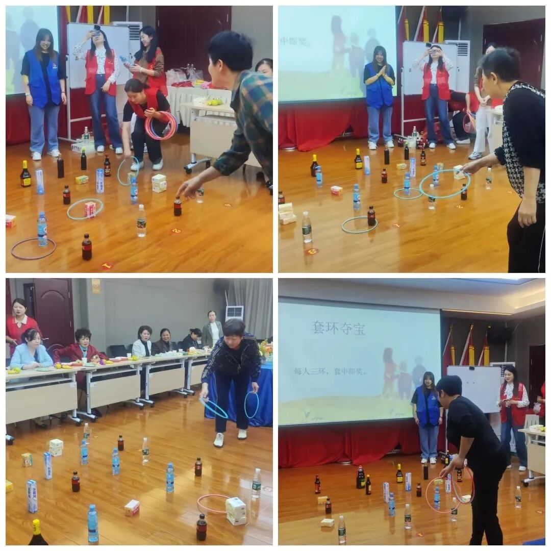 “套环夺宝”是一个趣味性较高的游戏,每个人三个套环,活动中,大家聚精会神地将套环抛向自己中意的奖品,随着一声高过一声的欢呼声四起,大家收获满满,脸上洋溢着愉悦的笑容。