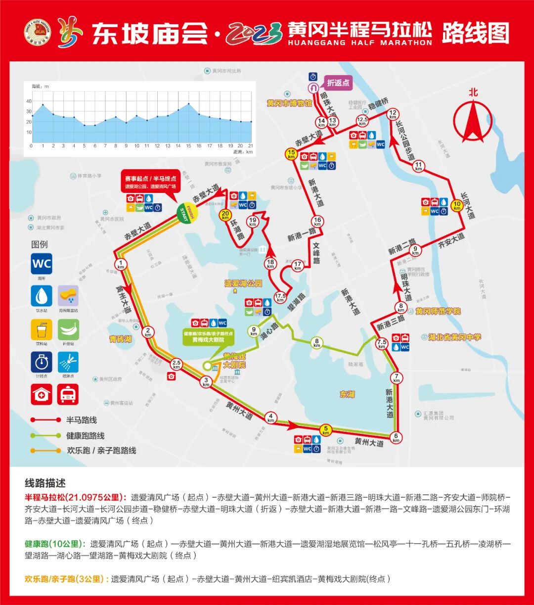 起点设在黄冈遗爱湖风景区遗爱清风广场,途经赤壁大道、黄州大道等,半程马拉松终点设在遗爱清风广场,健康跑、欢乐跑和亲子跑的终点设在黄梅戏大剧院。