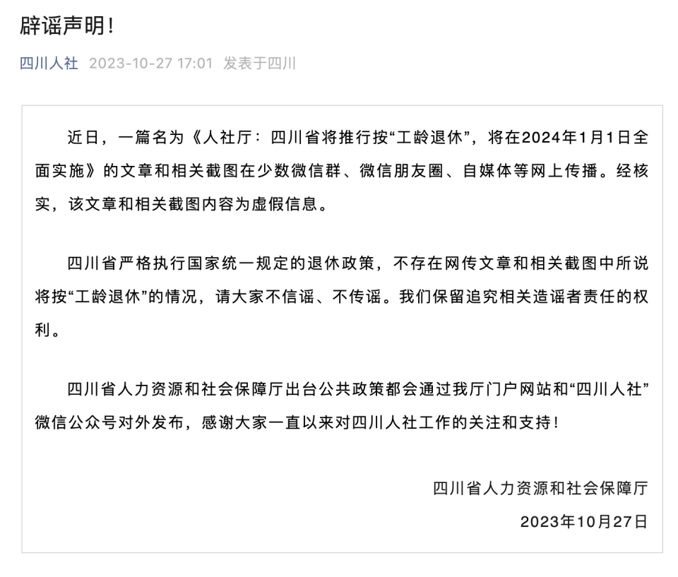 近日,一篇名为《人社厅:四川省将推行按“工龄退休”,将在2024年1月1日全面实施》的文章和相关截图在少数微信群、微信朋友圈、自媒体等网上传播。经核实,该文章和相关截图内容为虚假信息。