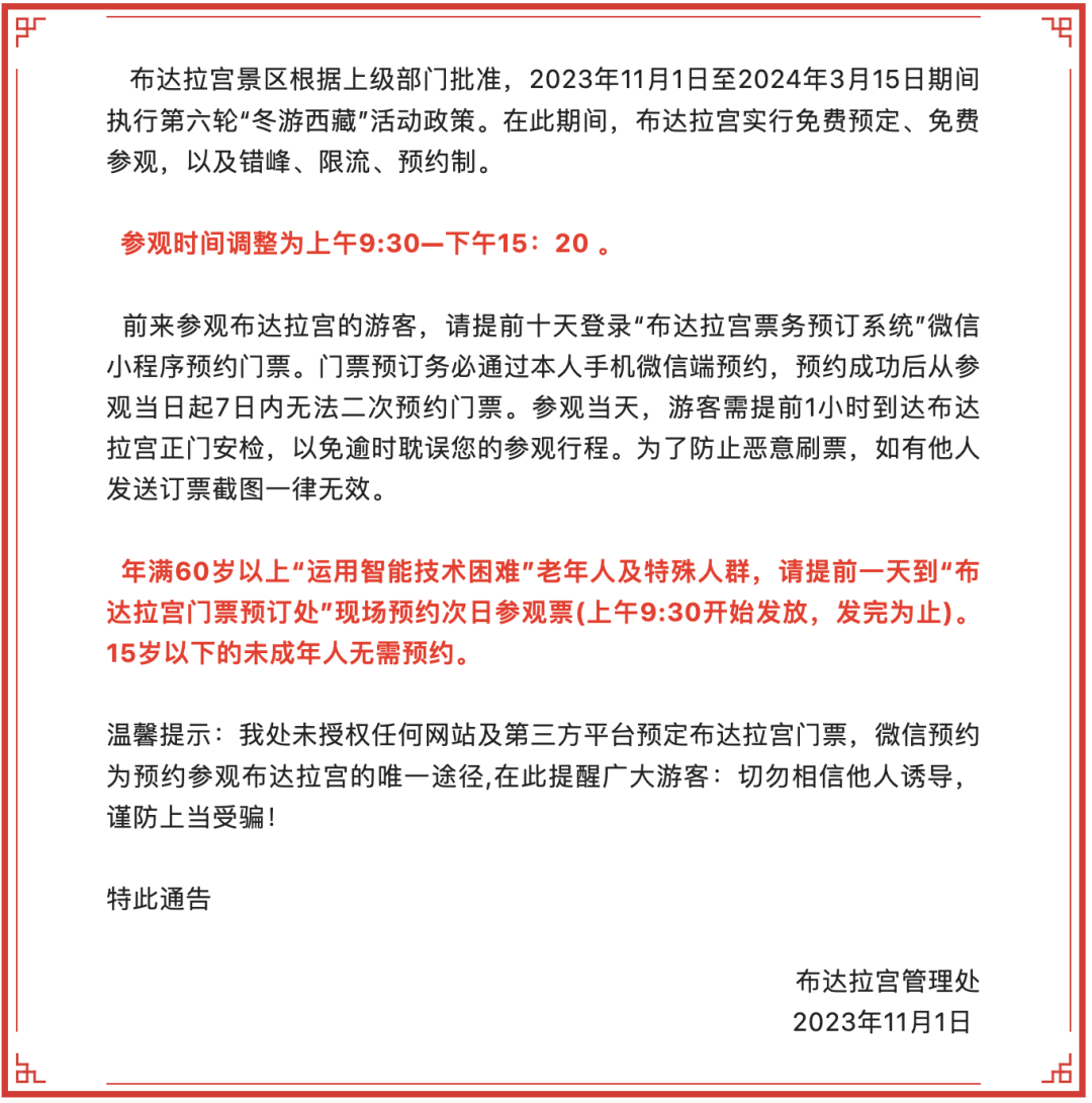 11月1日,布达拉宫管理处发布通告:布达拉宫景区根据上级部门批准,2023年11月1日至2024年3月15日期间执行第六轮“冬游西藏”活动政策。在此期间,布达拉宫实行免费预定、免费参观,以及错峰、限流、预约制。参观时间调整为上午9:30—下午15:20。