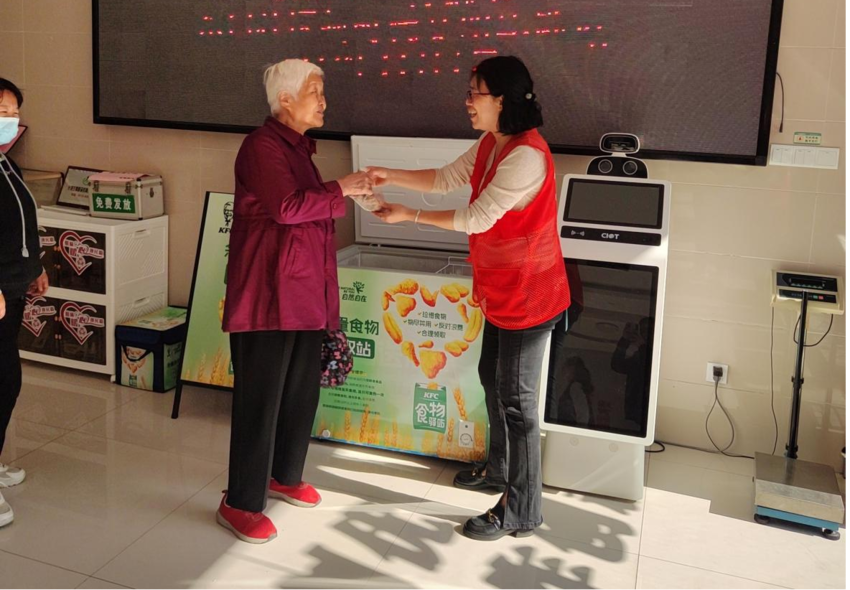 居然之家肯德基店“食物驿站”每日下午三点投放食物,供有需要的社区居民按需领取,有效减少食物浪费。有需求但行动不便的居民,由社区工作人员配送上门。兼职配送的社区工作人员都办理了健康证,确保食品安全。