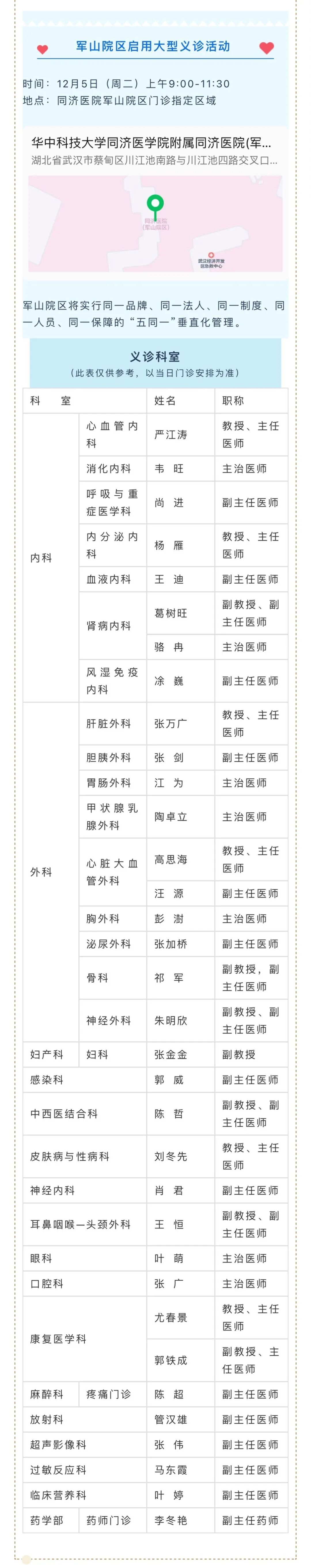 军山院区将重点引进康复医学、内科、外科、妇科、神经科、中医科、眼科、耳鼻喉-头颈外科、口腔科等优质医疗资源,计划设置1000张住院床位,同济医院医疗装备研究院、国家医学中心获批后也将入驻。