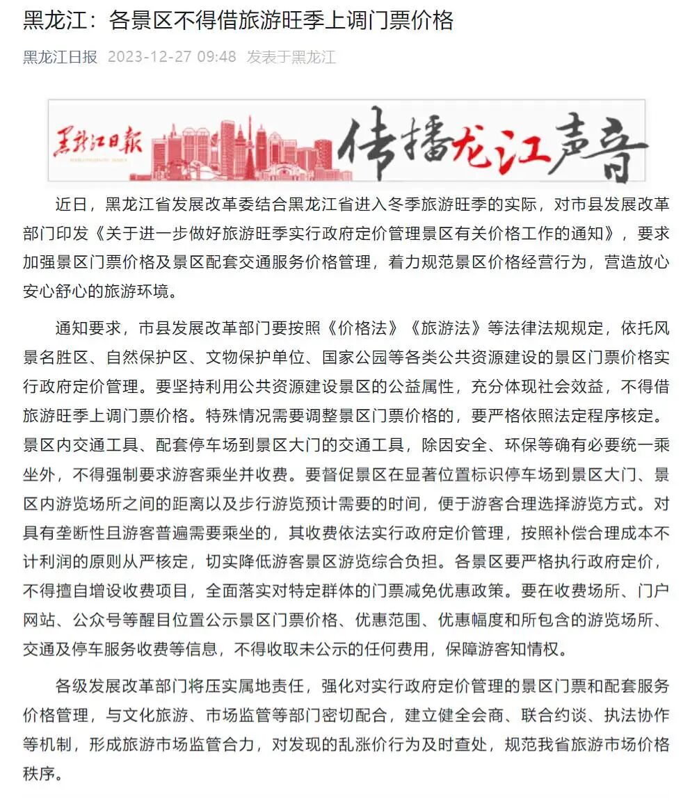 日前,黑龙江省发展改革委印发《关于进一步做好旅游旺季实行政府定价管理景区有关价格工作的通知》,要求加强景区门票价格及景区配套交通服务价格管理,着力规范景区价格经营行为,营造放心安心舒心的旅游环境。通知要求,市县发展改革部门要按照《价格法》《旅游法》等法律法规规定,依托风景名胜区、自然保护区、文物保护单位、国家公园等各类公共资源建设的景区门票价格实行政府定价管理。要坚持利用公共资源建设景区的公益属性,充分体现社会效益,不得借旅游旺季上调门票价格。