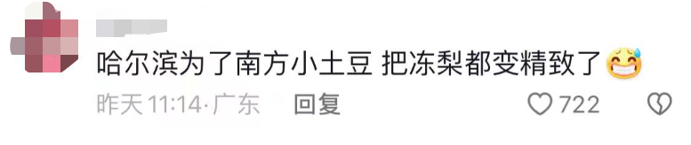 最近,还有网友分享了在哈尔滨吃的冻梨,有人在评论区调侃:“哈尔滨为了南方小土豆,把冻梨都变得精致了”。