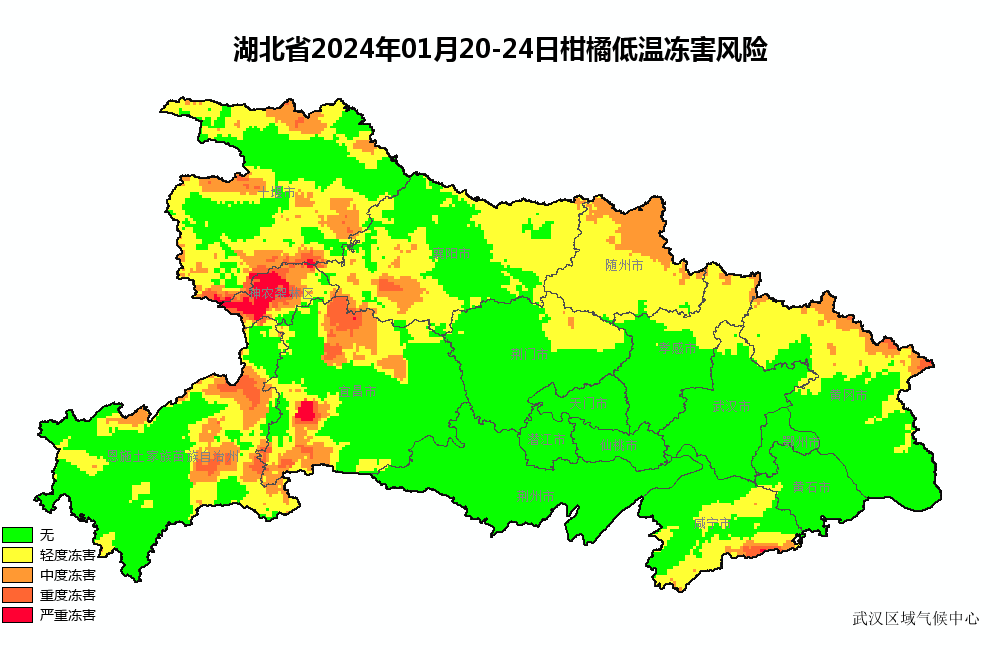 图2 湖北省2024年1月20日至24日柑橘冻害风险预警图