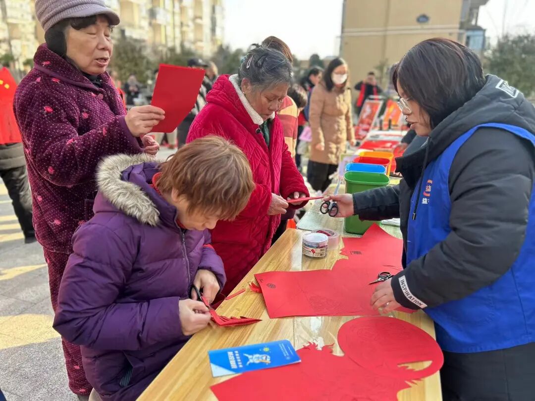 本次公益集市活动包含便民服务、年货义卖、民俗文化体验三大主题,活动现场设置了春联送福、爱心义诊、年货义卖、非遗拓印体验、公益宣传、巧手剪窗花等15个志愿服务摊位,前来“赶集”的居民络绎不绝,热闹非凡。50余名志愿者在各自摊位前忙得不亦乐乎,为居民提供义诊、义卖、写春联、游戏互动等志愿服务。