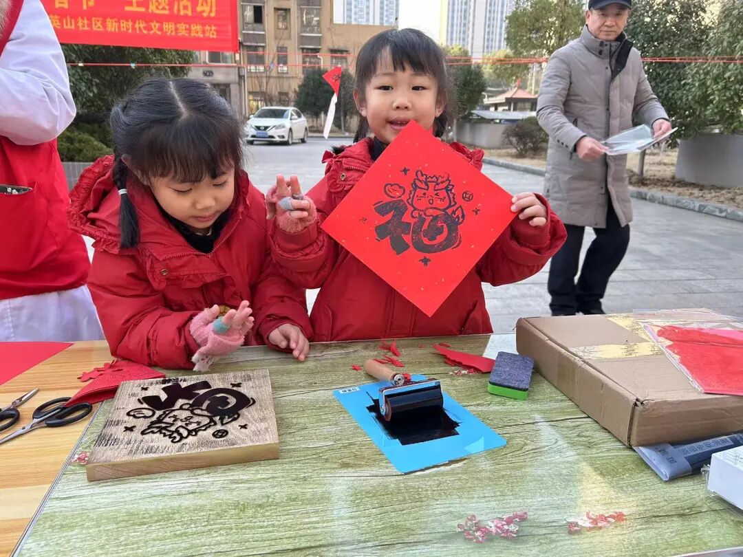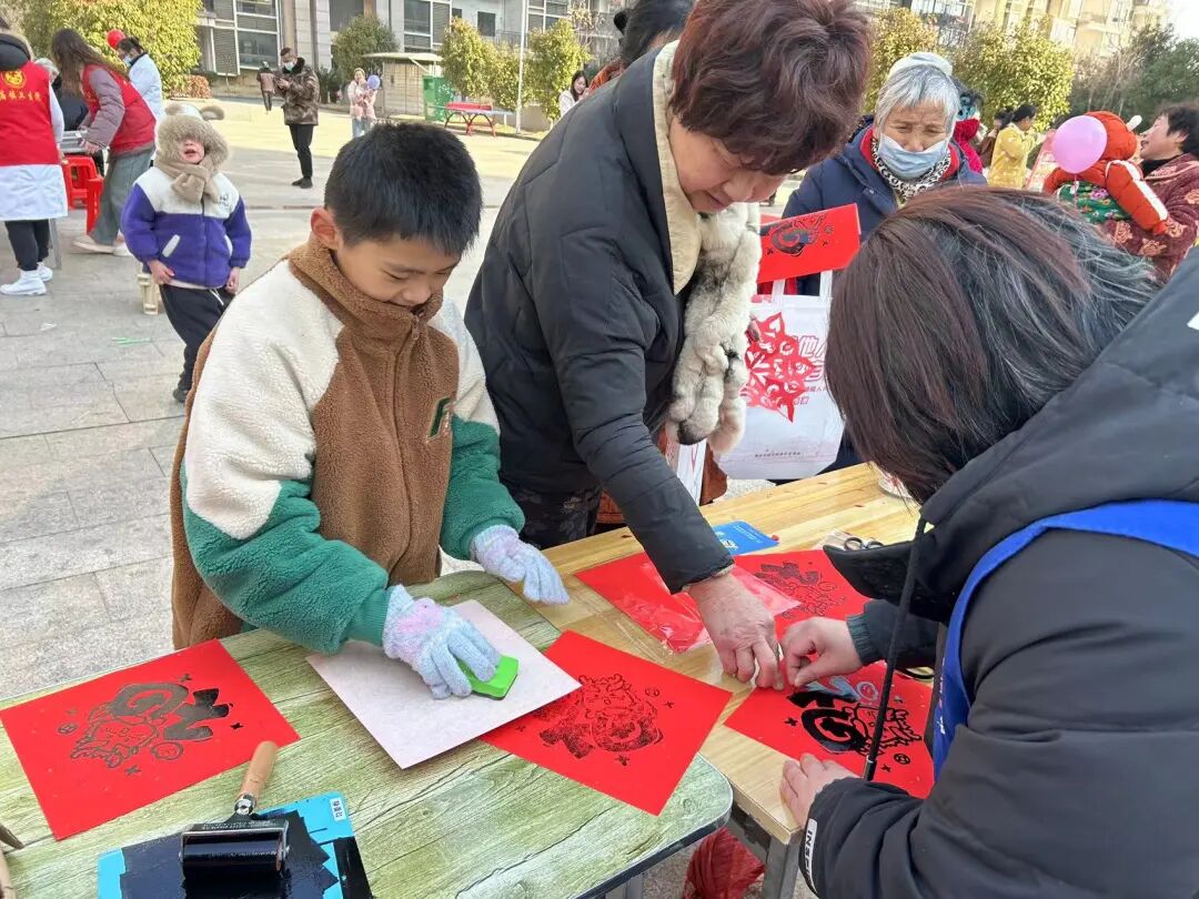 在民俗文化体验区,来自鄂州市书法家协会的书法志愿者们挥毫泼墨,将美好的祝愿、浓浓的年味浓缩在一笔一划之间,一幅幅气韵生动,寓意吉祥的春联,成为现场焦点。“闻墨”而来的居民群众纷纷排起长队“打卡”认领春联。拓印、剪纸手工体验活动也在火热进行,居民们跃跃欲试,不一会儿,原本空白的纸面上跃然出现了祥龙、“福”字、金鱼、窗花等富有祝福寓意的事物,为现场增添了浓浓的年味。