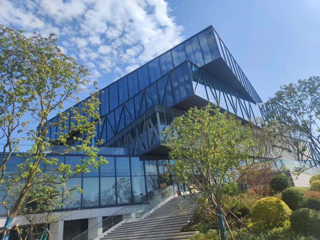 建筑材料主要使用玻璃幕墙及玻璃与金属网复合的双层幕墙。不同的材质对建筑体块进行包裹,通过控制金属网的疏密,形成不同透明度体块堆叠旋转的效果。各层体块之间由斜向楼梯连接,楼梯将V字形支撑构件结构外露,作为造型元素,串联上下。