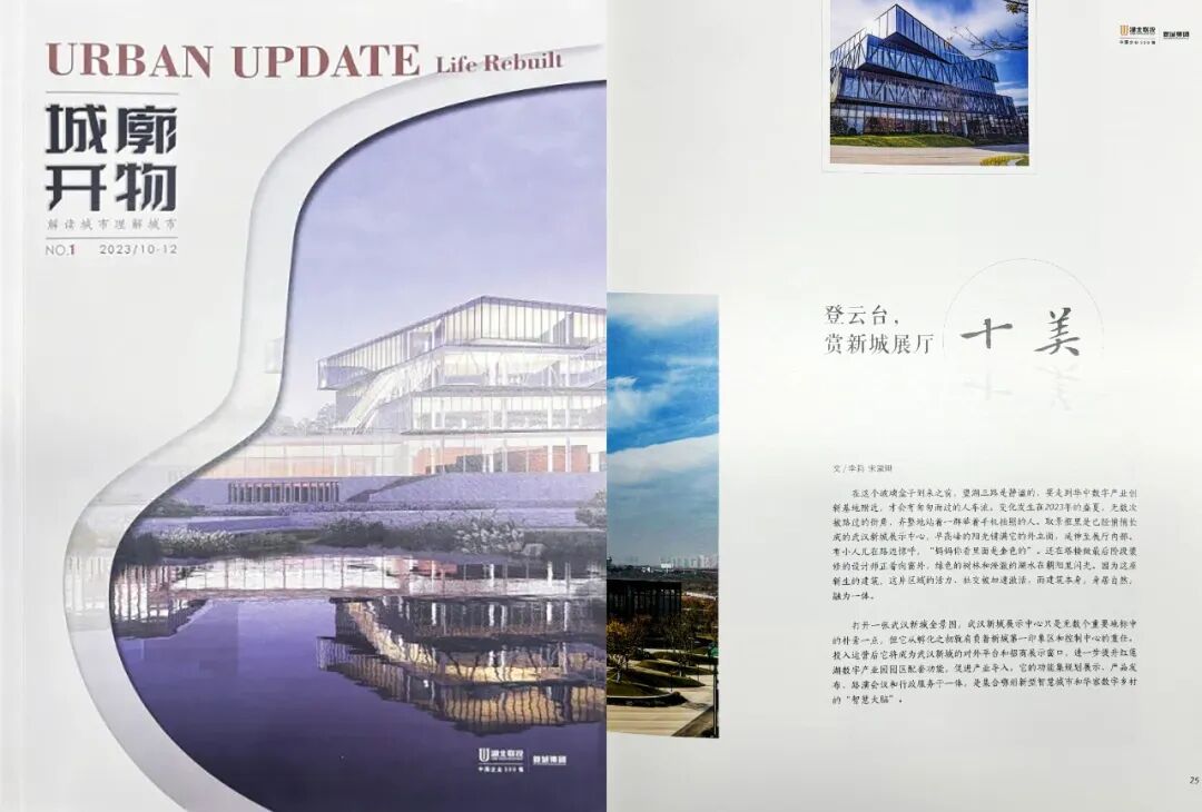 在这个玻璃盒子到来之前,望湖三路是静谧的,要走到华中数字产业创新基地附近,才会有匆匆而过的人车流。变化发生在2023年的盛夏,无数次被路过的街角,齐整地站着一群举着手机拍照的人。取景框里是已经悄悄长成的武汉新城展示中心,早高峰的阳光铺满它的外立面,延伸至展厅内部。有小人儿在路边惊呼,“妈妈你看里面是金色的”。还在塔楼做最后阶段装修的设计师正看向窗外,绿色的树林和澄澈的湖水在朝阳里闪光。因为这座新生的建筑,这片区域的活力、社交被加速激活,而建筑本身,身居自然,融为一体。