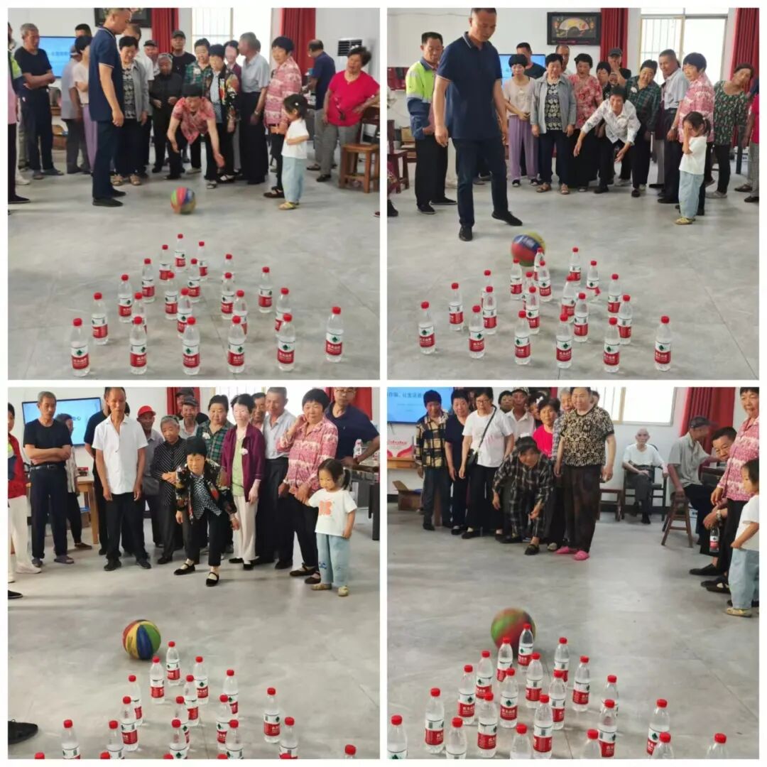 要说最让大家开心的,那当属“趣味保龄球”了。将矿泉水瓶巧妙排列成保龄球瓶的形状,老朋友们手持篮球轻轻滚动,尝试击倒瓶子。只要击倒三个便能获得礼品,在享受运动乐趣的同时,也锻炼了眼手协调能力。