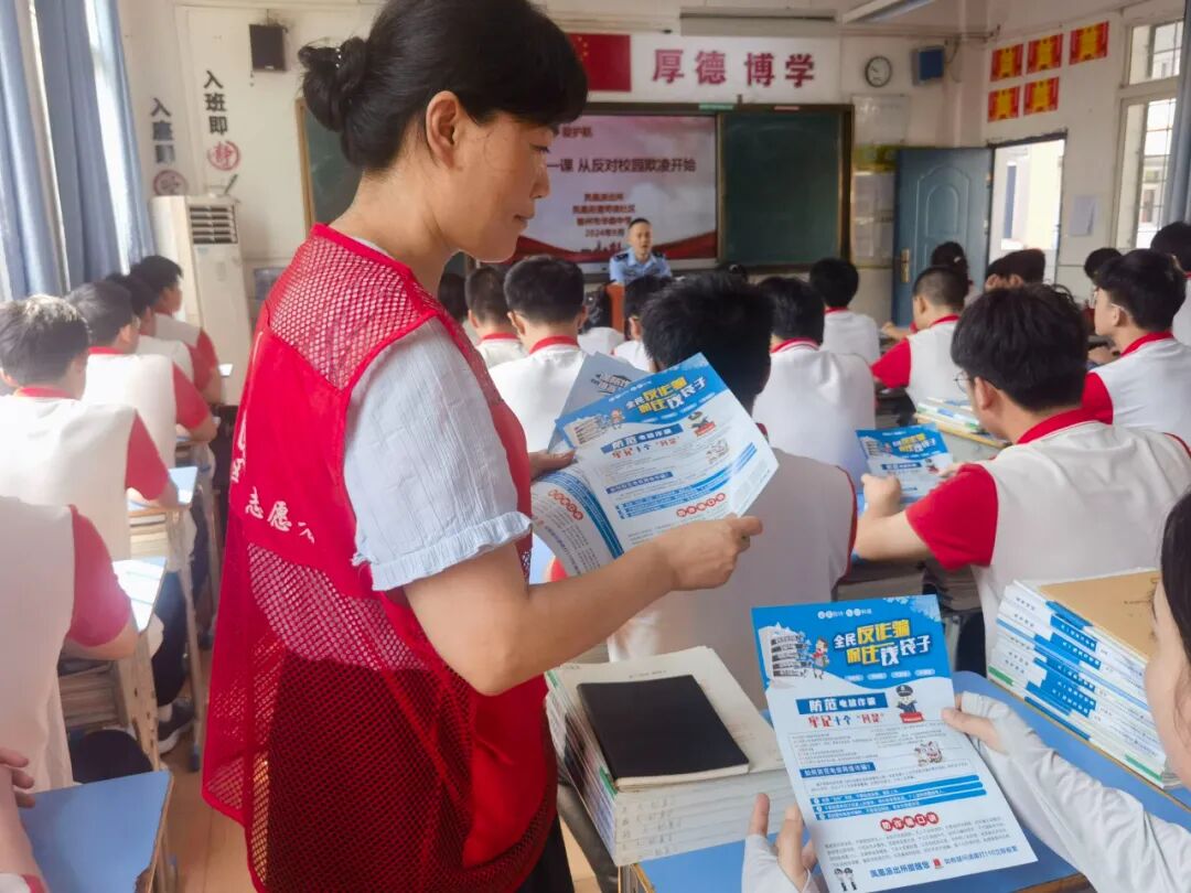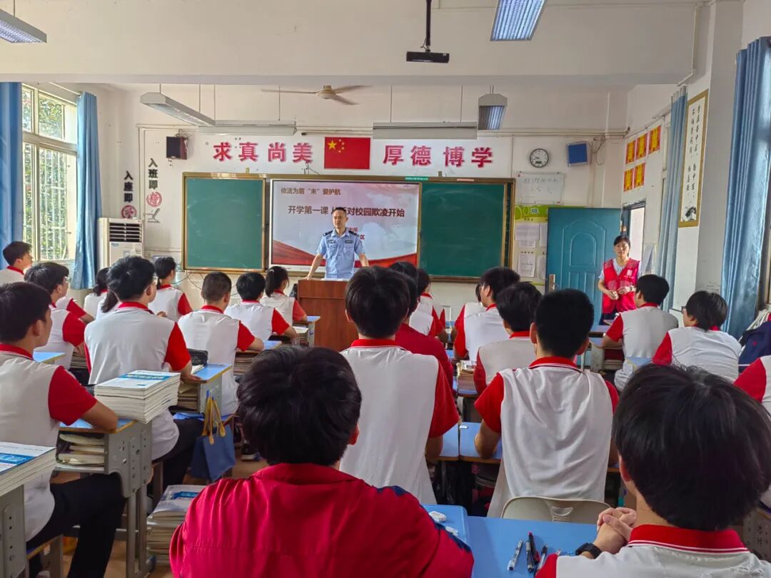 活动伊始,凤凰派出所李凯警官首先向在场的学生送上了开学祝福,希望他们在新学期奋力拼搏,取得更好的成绩,接着,李警官结合近年来校园欺凌引发的案例,通过以案释法的方式,向学生们详细讲解了什么是校园欺凌、校园欺凌的常见表现形式、校园欺凌的危害、面对校园欺凌应采取的应对措施以及如何自我保护等相关法律法规知识,让学生们深刻认识到校园欺凌的严重性和危害性,教育引导学生学法、懂法、用法、守法,学会运用法律武器维护自己合法权益;同时,呼吁同学们不做“欺凌者”、不做“受害者”、不做“旁观者”,坚定勇敢地向校园欺凌说“不”。
