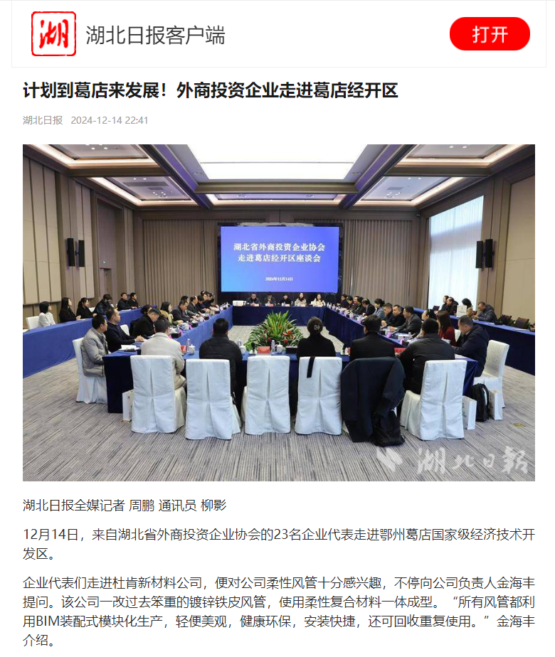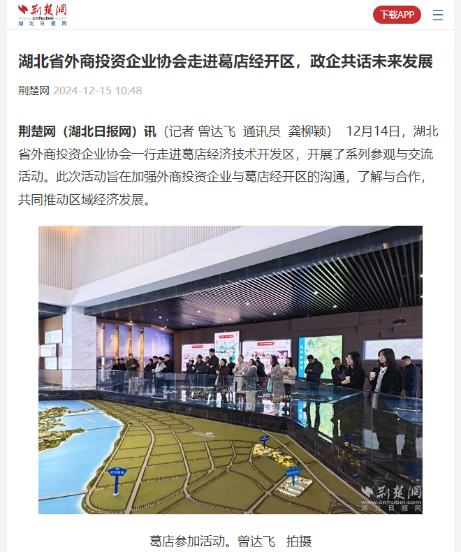 12月14日,“外商投资企业走进葛店经开区”活动在湖北葛店举行,来自湖北省外商投资企业协会的23名企业代表、3家葛店企业代表参加此次活动,共话合作新机遇。