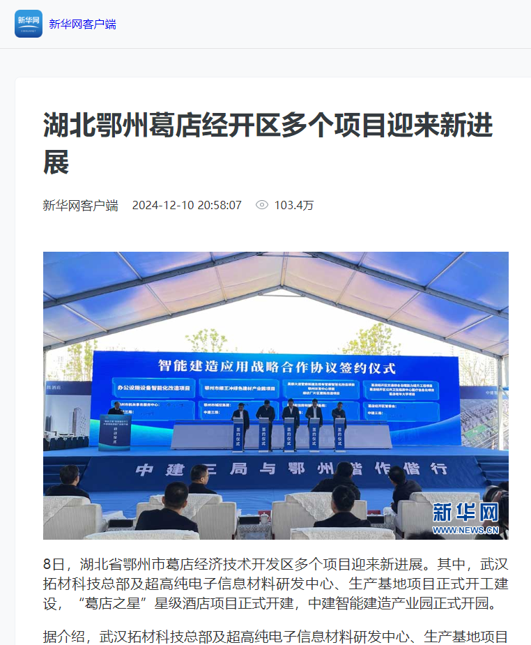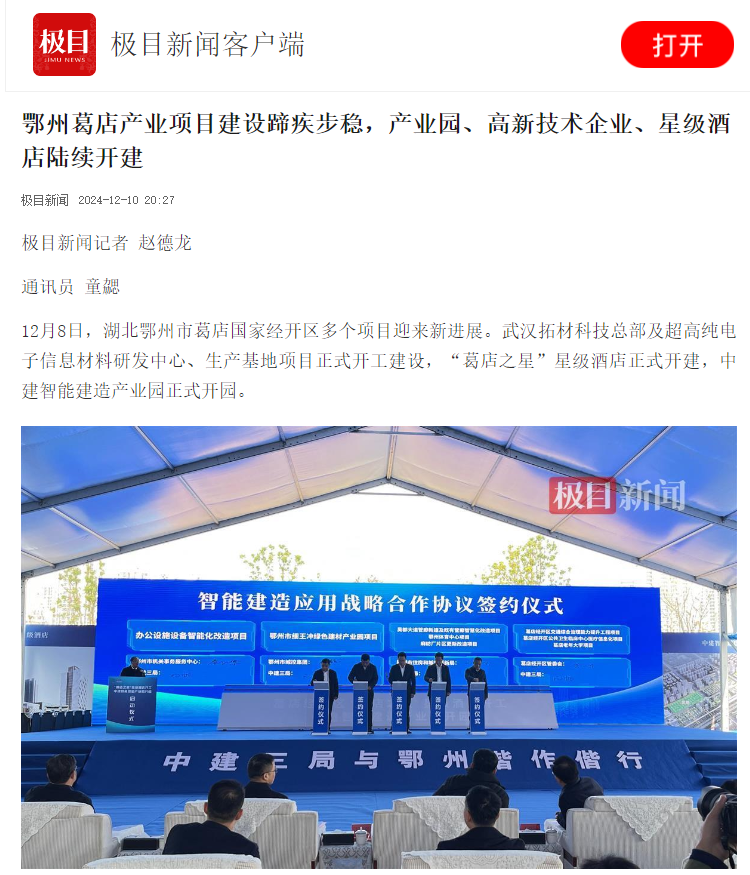 12月8日,湖北省鄂州市葛店经济技术开发区多个项目迎来新进展。其中,武汉拓材科技总部及超高纯电子信息材料研发中心、生产基地项目正式开工建设,“葛店之星”星级酒店项目正式开建,中建智能建造产业园正式开园。