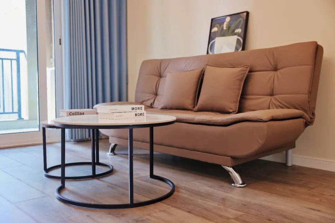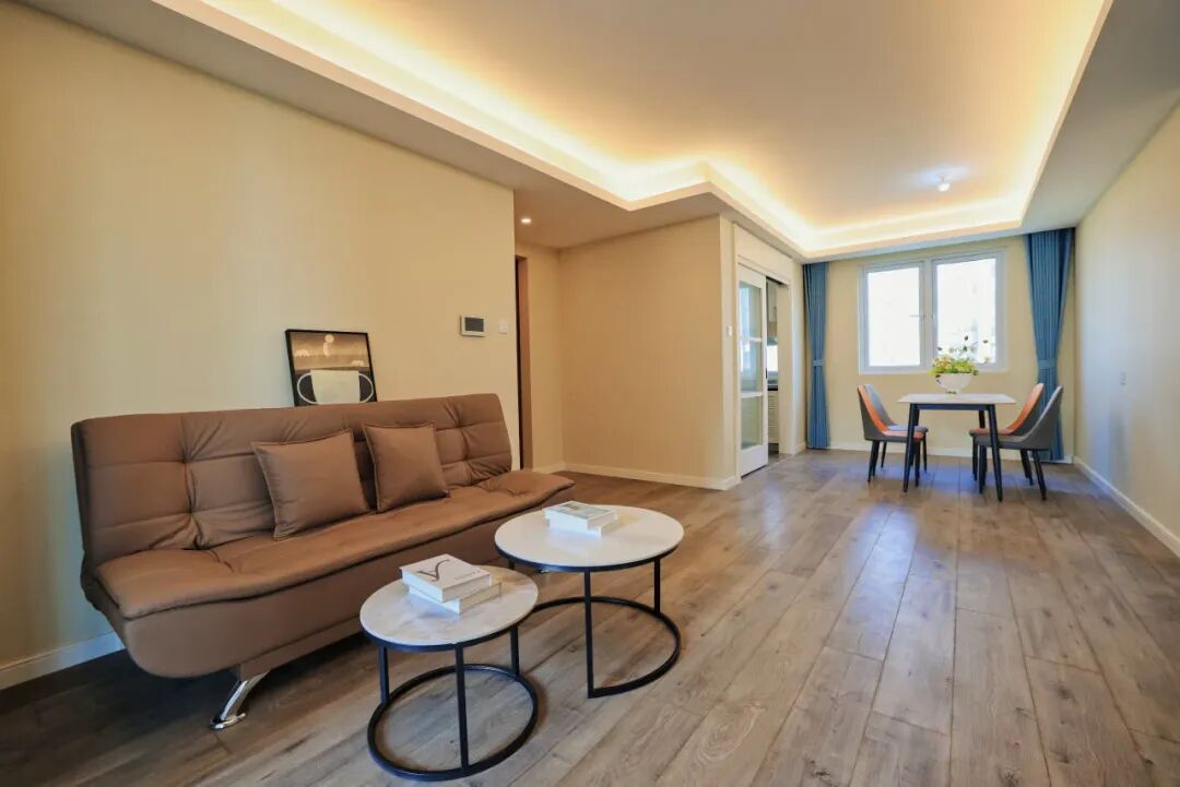 步入公寓内部,暖色调的墙纸搭配暖白色的门框,让整个空间显得温馨舒适。现代的餐桌套组、柔软的皮质沙发、实用的灰色调大床,每款家具都精心挑选,只为给人才带去温馨惬意的归家感觉。