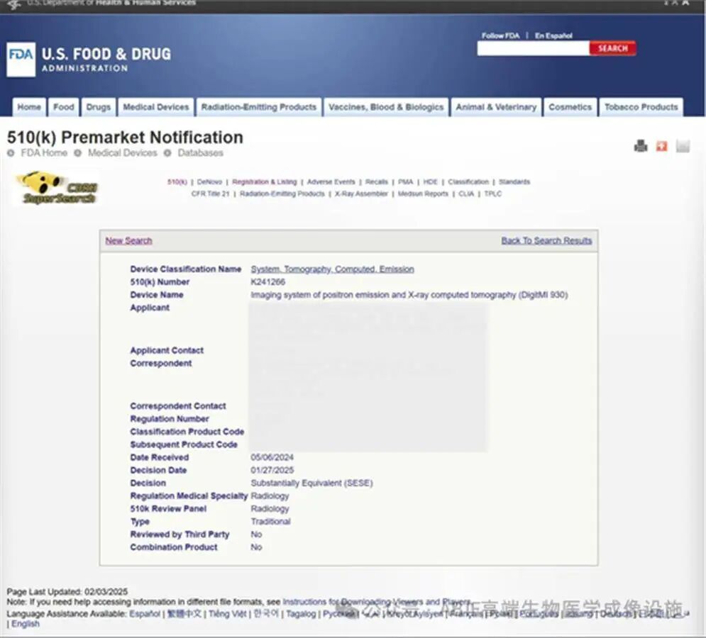 在此前不久,1月27日,由锐世医疗研发的临床全身全数字PET/CT(DigitMI 930)顺利通过FDA(美国食品药品监督管理局)注册认证,正式获得在美国的市场销售资格。